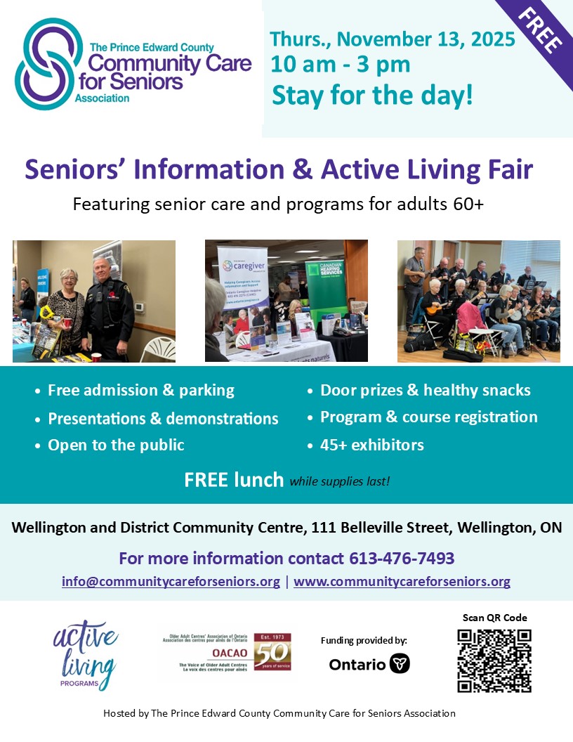 Prince Edward Community Care is hosting the seventh annual FREE Seniors Information and Active Living Fair. There will be over 50 vendors from the community showcasing the services they offer, as well as presentations and demonstrations. This event starts at 10:00am with Opening Ceremonies and activities until 3:00pm. Organizers recommend planning to attend for the full day.  All are welcome! Free lunch & refreshments while supplies last. Call Community Care for more information about the fair at 613-476-7493. www.communitycareforseniors.org